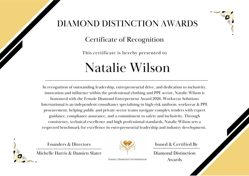 We are proud to celebrate our Founder & MD Natalie Wilson, who has been honoured with a Female Diamond Entrepreneur Award 2026 for Leadership, Innovation and Industry Influence within the Professional Clothing and PPE Sector.